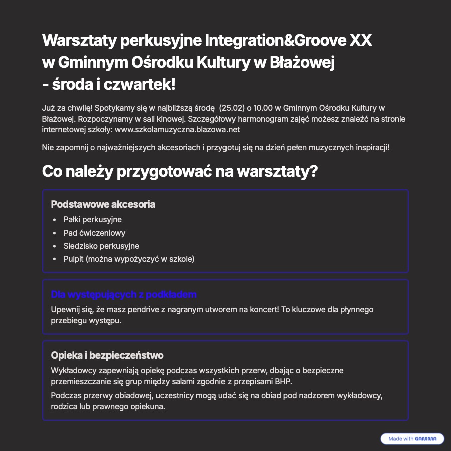 INTEGRATION&GROOVE XX – REGULAMIN i szczegółowe informacje: utworzone przez Karol Nabożny | lut 23, 2026 | 0 komentarzy REGULAMIN WARSZTATÓW PERKUSYJNYCH I&G XX: REGULAMIN-IG-XXPobierz FORMULARZ ZGŁOSZENIOWY: INTEGRATION GROOVE XX Harmonogram warsztatów perkusyjnych „Integration&Groove XX”